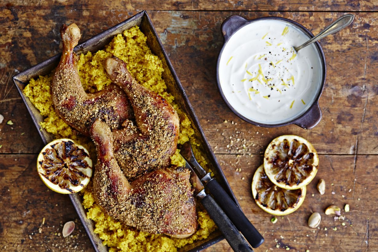 Tarjoa dukkah-broilerin lisäkkeenä kurkumalla värjättyä couscousia ja sitruunajogurttia.