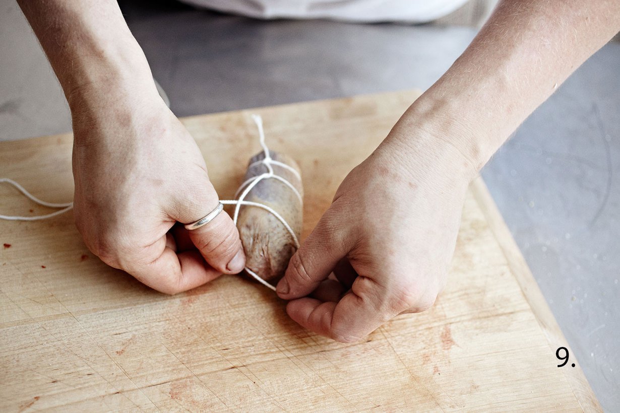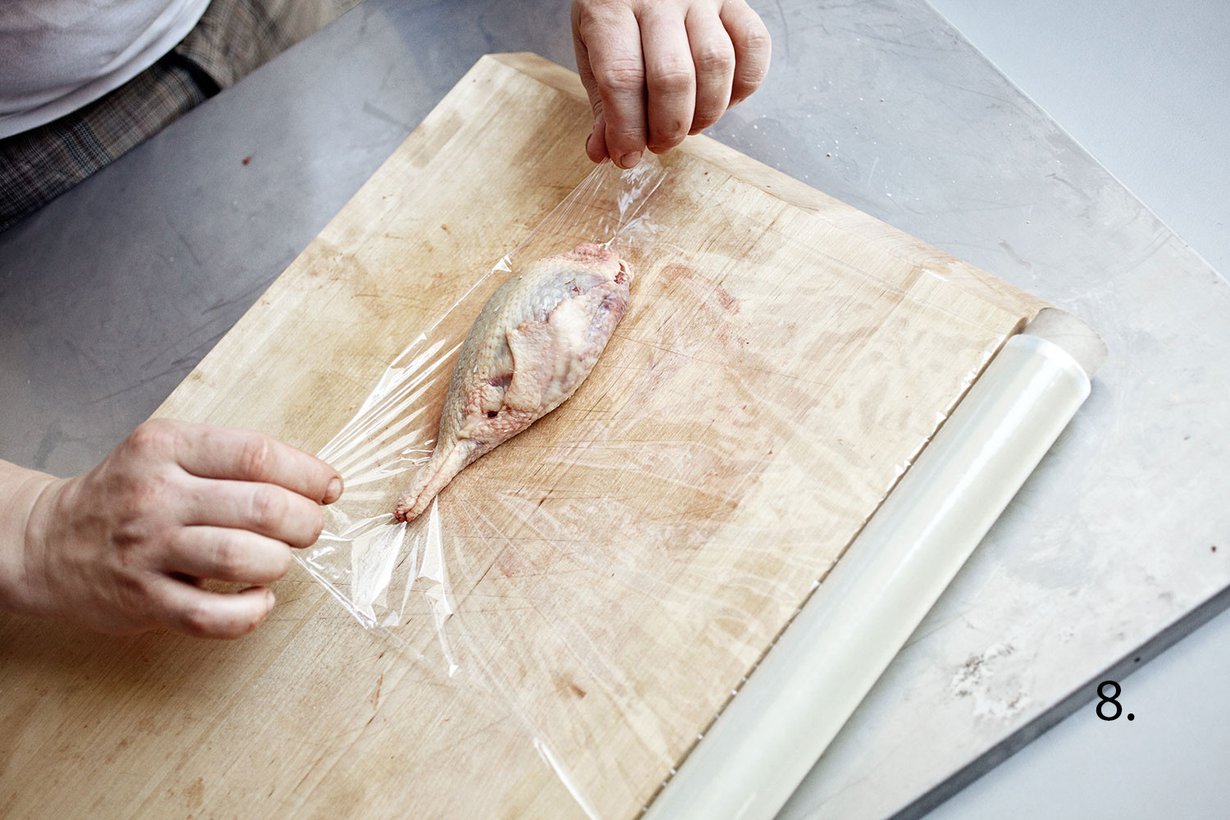 - Valmista kyyhkyballottinet ja esikypsennä ne tuorekelmuun ja folioon käärittyinä kuumassa vedessä. Siirrä jäähtyneet ballottine-kääröt jääkaappiin.