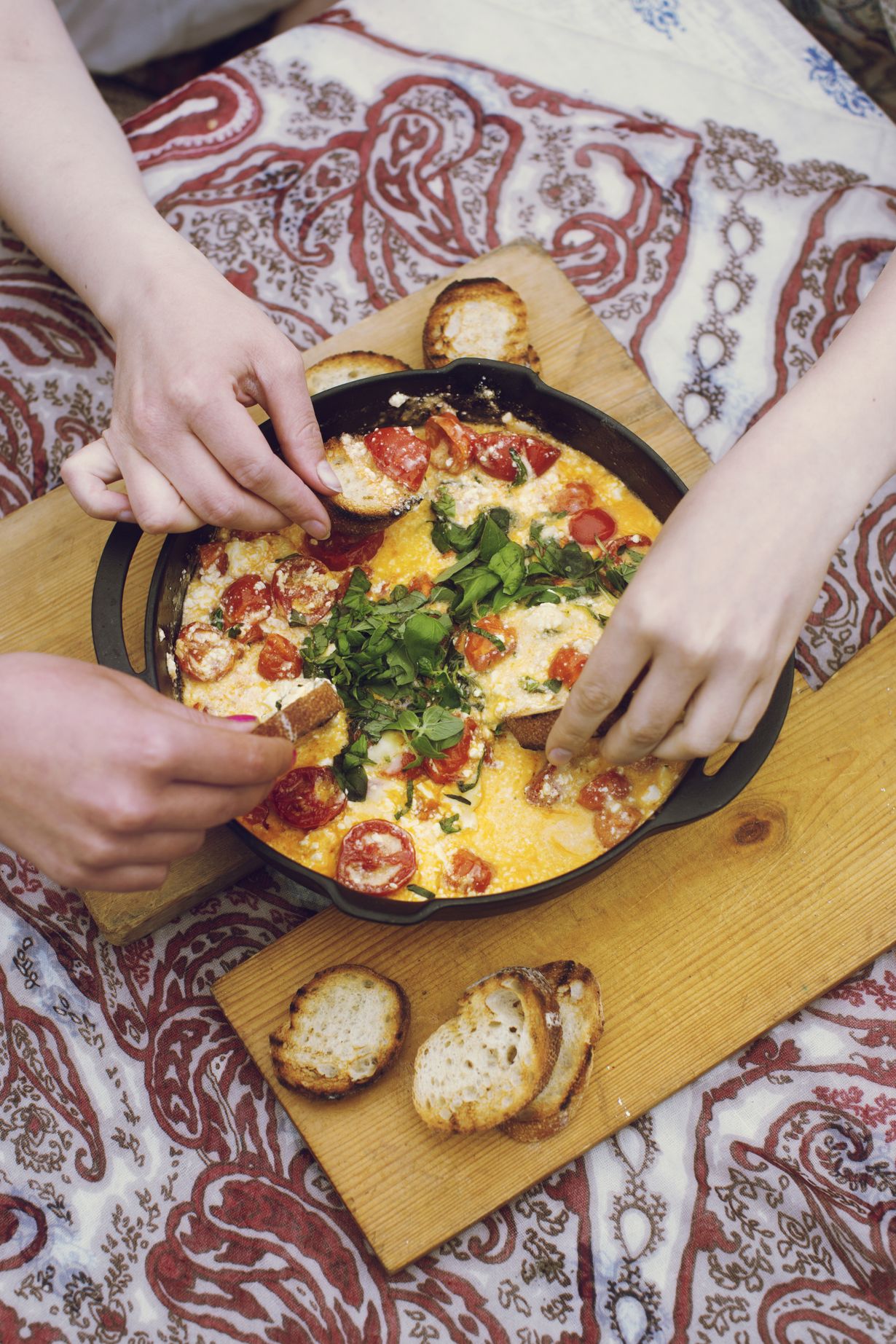 Grillissä valmistuu ihanan syntinen dippi. Paahdetut leivät ja juusto-tomaattidippi maistuvat yhdessä ihan pizzalle!