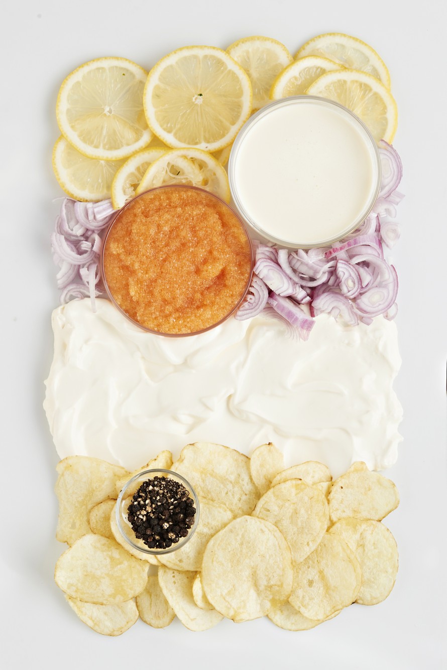 Sekoita dipin ainekset kulhossa, jätä mätiä koristeluun. Tarjoa sipsien kanssa.