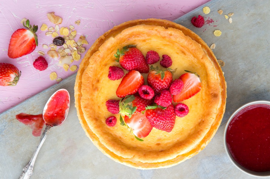 Tämän maailmankuulun juustokakun rouhea pohja valmistetaan myslistä. Kermainen kakku kruunataan punaisista marjoista valmistetulla kirpsakalla melballa. Nam, mikä kesäherkku!