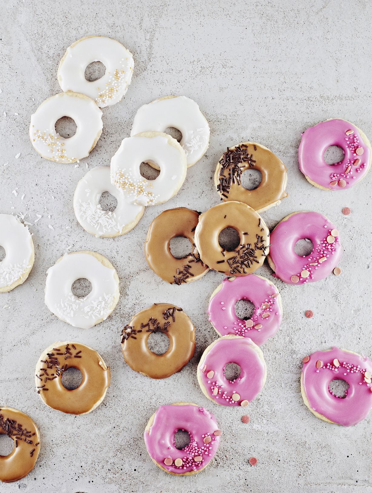 Rapeat murotaikinakeksit naamioituvat donitseiksi, kun ne saavat ylleen sokerikuorrutteen. Valitse lempimakusi: valkoinen kookoskuorrutus, ruskea mokka tai pinkki mansikka.