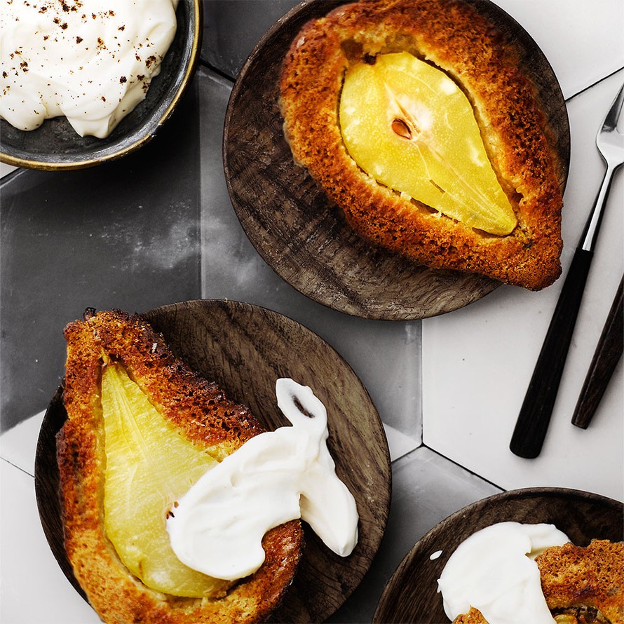 - Aseta päärynänpuolikkaat leivinpaperilla vuoratulle uunipellille kotapuoli alaspäin. Sivele hunaja kuoren päälle ja painele kaulitut taikinapalat päärynän päälle niin, että hedelmä peittyy kokonaan.