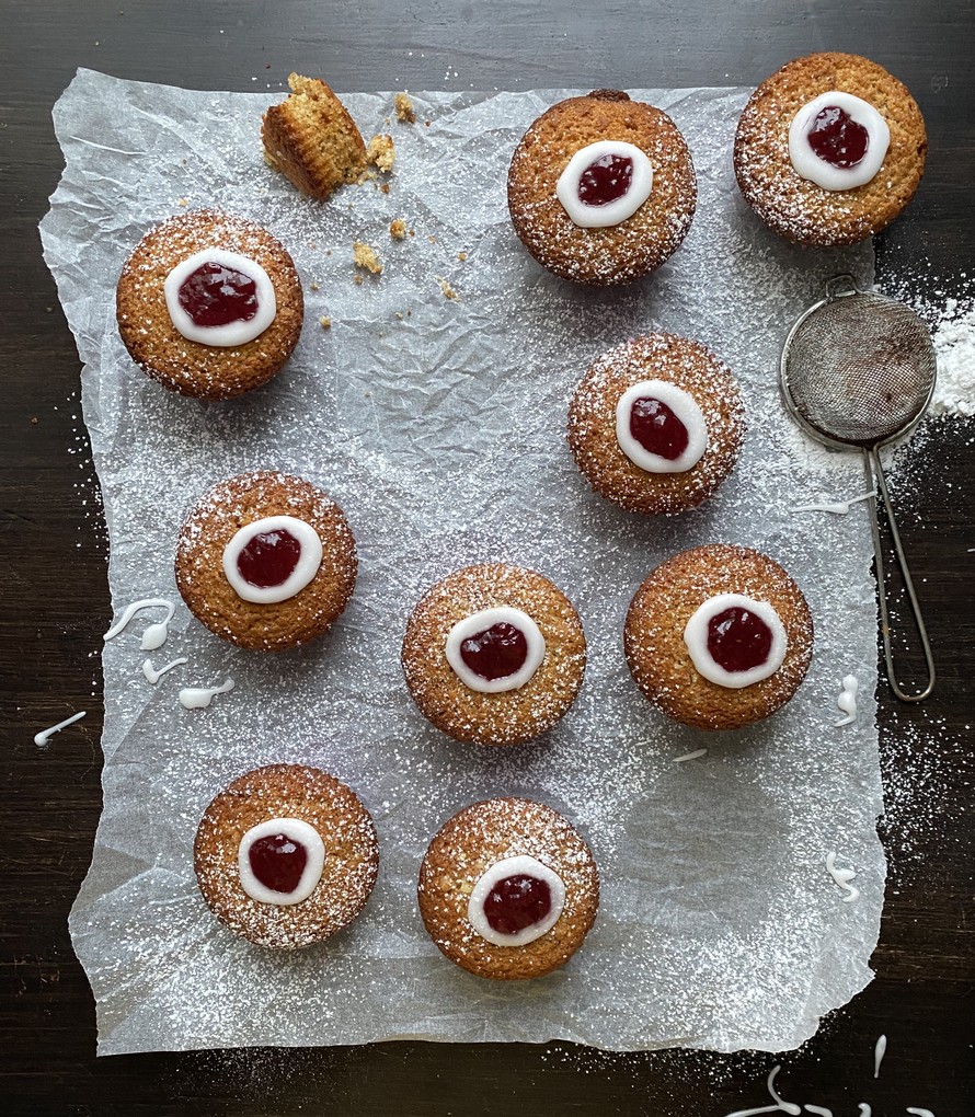 Näihin muffinimaisiin runebergintorttuihin ei tarvita kostutusta, sillä koostumus on jo itsessään hyvä ja sopivan mehevä.