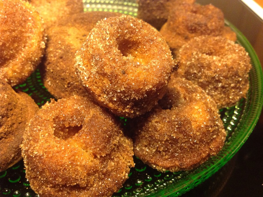 Sekoita öljy, jugu ja muna keskenään. Yhdistä kuivat aineet omassa astiassa ja sekoita ne nopeasti nesteen sekaan. Pursota taikina donitsipellille ja paista 200 asteessa 10 - 15 minuuttia. Taikina kohoaa PALJON, joten ohut rinkula donitsipellin koloihin riittää. Donitsit on valmiina sitten kun ne on jo hieman ruskistuneet mutta itse pohdit vielä onko ne raakoja. Eivät ole, niiden kuuluukin olla pehmeitä.
