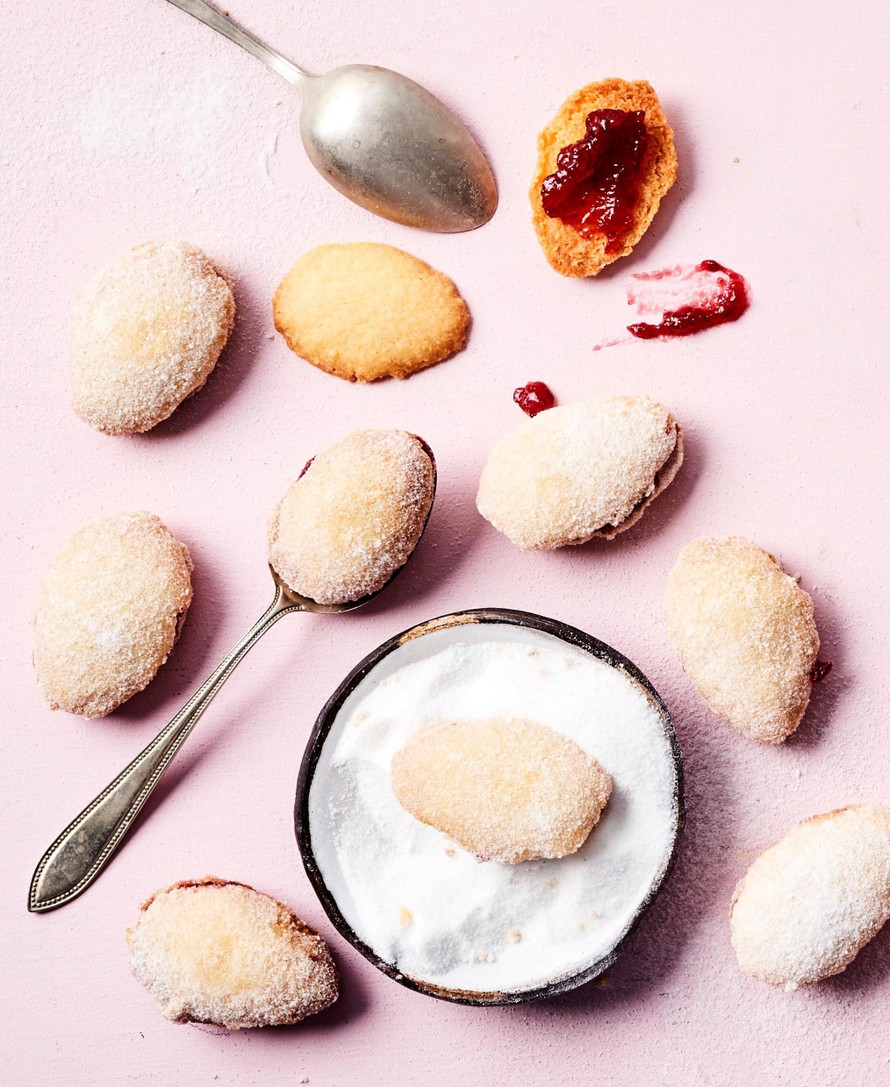 - Levitä pikkuleivän sileälle puolelle hilloa. Paina hillon päälle täyttämätön pikkuleipä. Kierittele valmiit lusikkaleivät vaniljasokerilla maustetussa sokerissa.