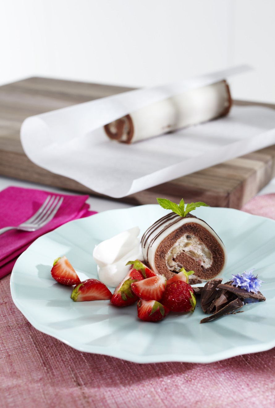 Ota n. A4-kokoinen pala leivinpaperia ja taittele siitä SAGA pursotin. Täytä sulatetulla tummalla suklaalla ja pursota kääretortun pintaan koristeraitoja. Nosta kääretorttu tarjoilulautaselle ja koristele halutessasi vielä tuoreilla mansikoilla ja vaniljakermavaahdolla.
