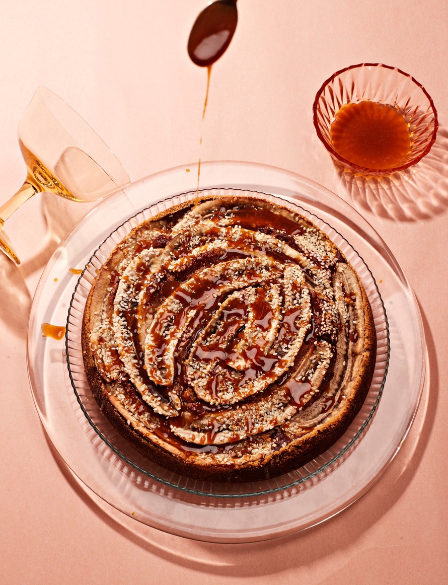 Leikkaa pinnalle tulevat banaanit pitkittäin ohuiksi viipaleiksi ja asettele ne taikinan pinnalle kehän muotoon. Ripottele siemenet päälle. Kypsennä 175-asteisessa uunissa noin 1 t. Anna jäähtyä hetki ennen irrottamista.