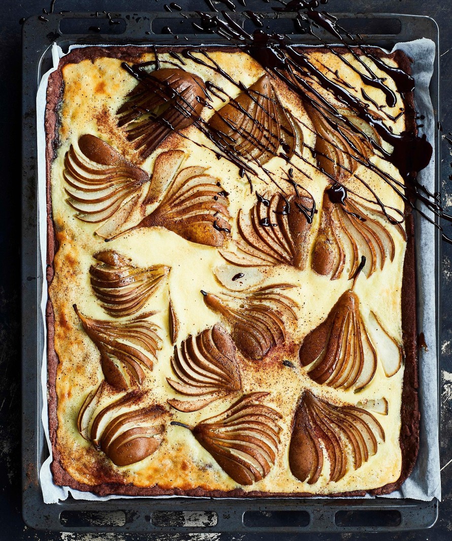 Rapea kaakaopohja ja lempeä ranskankermatäyte tekevät päärynäpiirakasta vastustamattoman. Tämä peltipiirakka toimii myös juhlissa, varsinkin kun viimeistelet sen lämpimällä suklaakinuskikastikkeella.