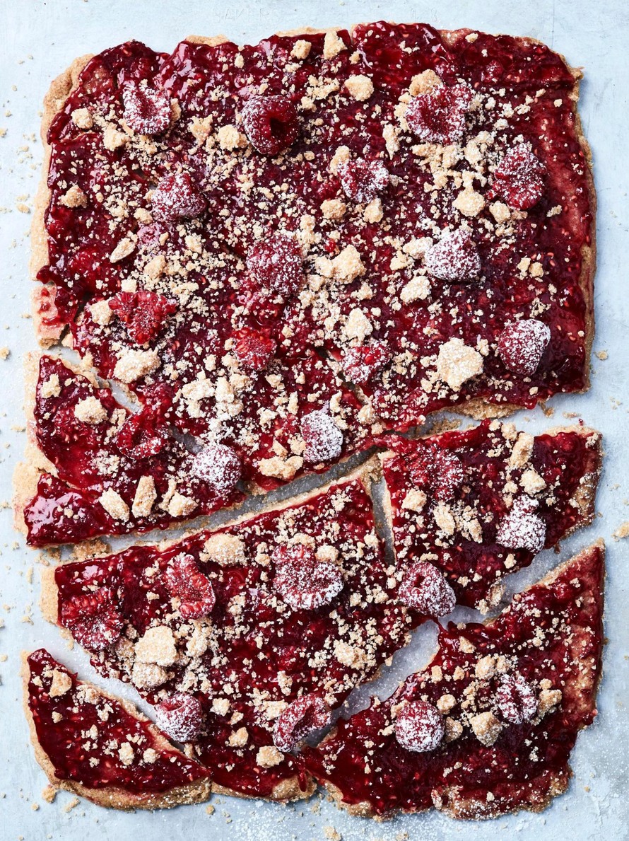Kun keksit ovat jäähtyneet, niistä toinen päällystetään vadelmahillolla ja toinen murennetaan päälle. Sitten peltilusikkaleipä on valmis paloiteltavaksi.
