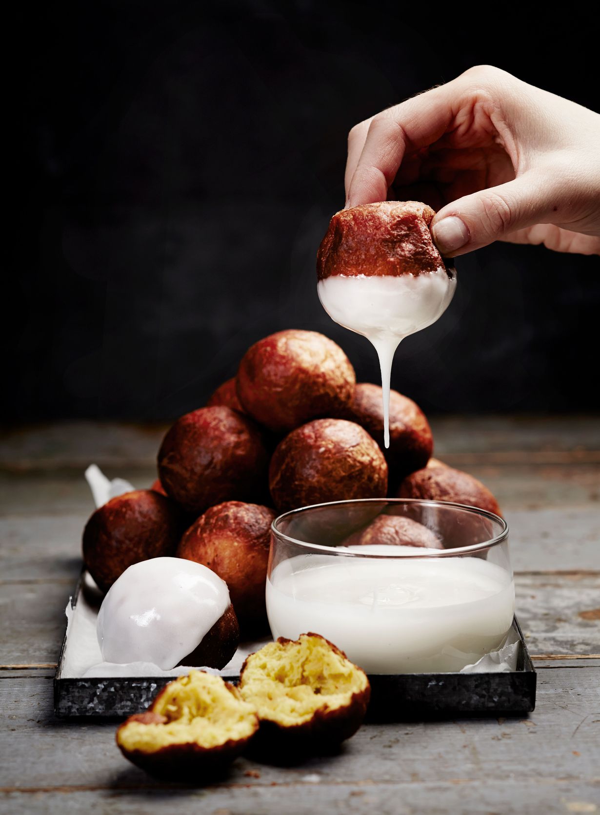 - Tee kuorrutus. Purista sitruunasta mehu ja sekoita se tomusokerin kanssa tasaiseksi seokseksi. Kasta jäähtyneet munkit kuorrutteeseen ja nosta hetkeksi kovettumaan leivinpaperin päälle. Tarjoa heti.