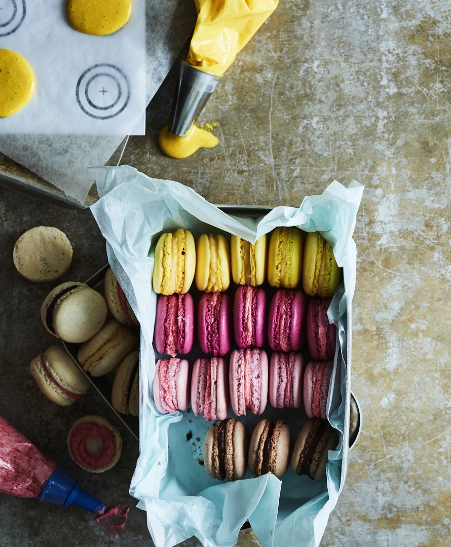 Vinkki! Lisää suklaamacaroneihin väriaineen sijaan 10 g makeuttamatonta kaakaojauhetta mantelijauheeseen sekoitettuna.