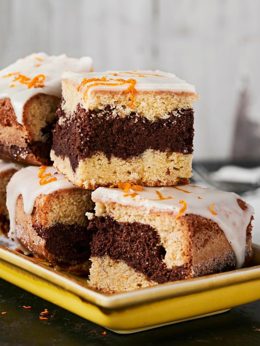 - Sekoita appelsiinimehu ja tomusokeri. Levitä kuorrutus kakun päälle. Leikkaa kakku neliönmuotoisiksi leivoksiksi.