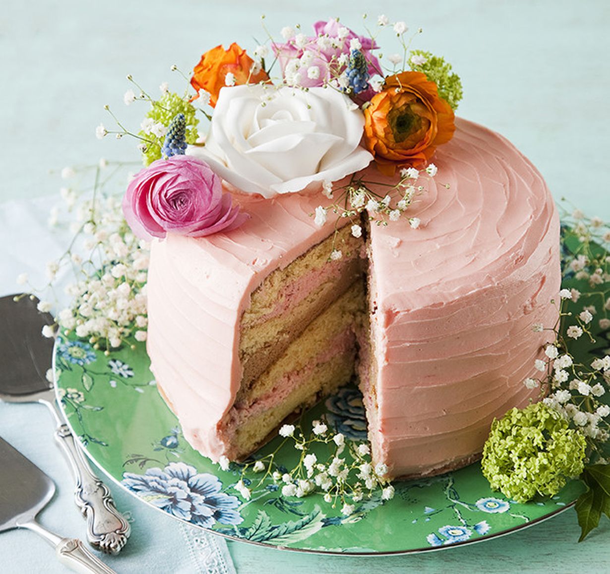 Aitojen kukkien koristama vaniljakakku lupaa makeaa mahan täydeltä: täytteessä maistuvat sitruuna, suklaa ja vanilja.