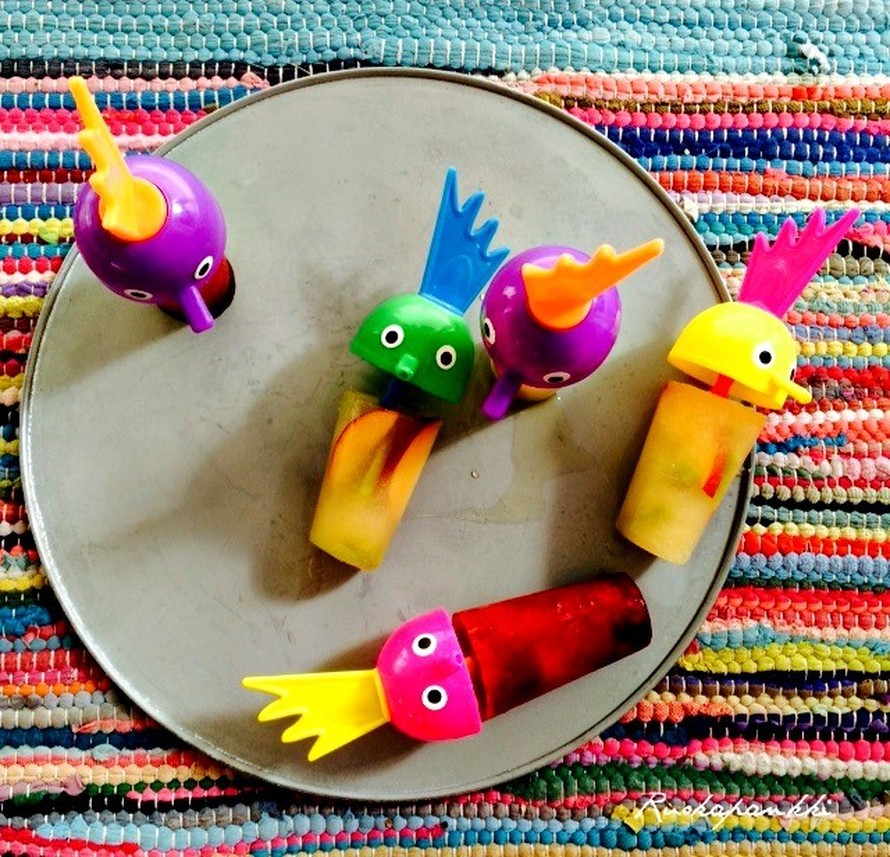 Laita mehujääpurkkien pohjalle ns. raskas tavara eli marjat tai hedelmät. Päälle nestettä. Sitten vaan kannet kiinni ja pakkaseen odottamaan jäätymistään, mieluiten yhden vuorokauden. Helppoa kuin mikä ja ihanuus kuumille kesäpäiville.