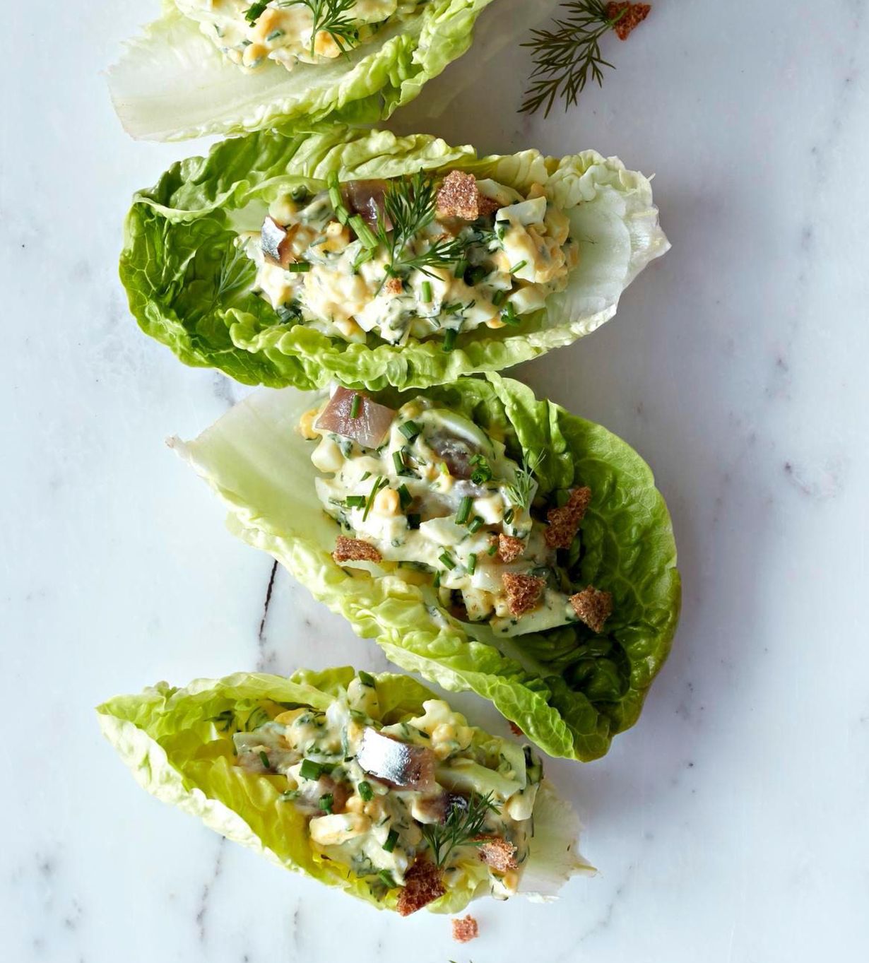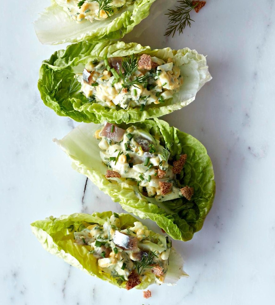 Ruotsalaisten rakastama gubbröra, muna-anjovistahna, sopii mainiosti matkustajaksi salaatinlehtiveneeseen. Tarjoa kemuissa sormin syötävänä salaattina.
