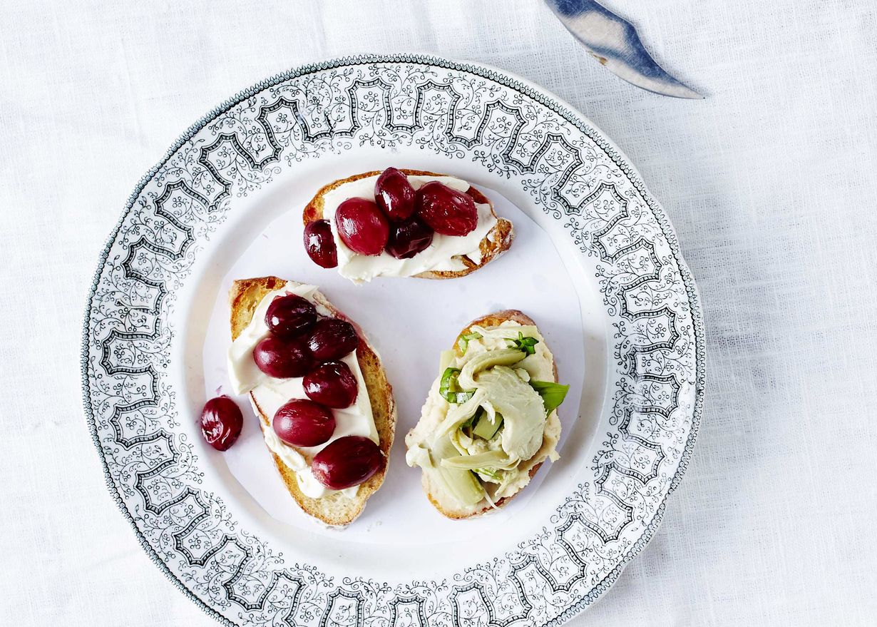 Paahdetuilla viinirypäleillä lastattu crostini on helppo herkku.