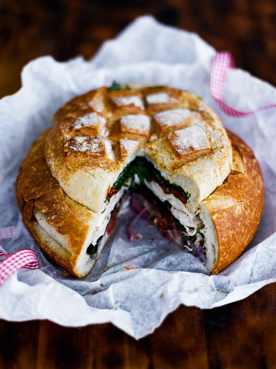 Täytä leipä. Levitä ensin 1 rkl sinappia leivän pohjalle ja nosta päälle paistetut sipulit. Asettele tomattiviipaleet sipuleiden päälle. Painele seuraavaksi kerrokseksi tuore pinaatti tiiviisti ja lisää päälle kerroksittain paistetut broilerifileet, mozzarella, basilika, aurinkokuivatut tomaatit ja lopuksi reilusti rucolaa. Voitele leivän kansipalan sisäpuoli sinappilla ja paina kansi leivän päälle.