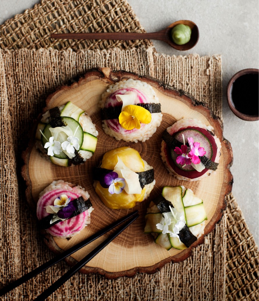 Kauniit vegesushit syntyvät näppärästi muffinipellin avulla. Juurikkaat koristavat ja antavat niille mukavaa rapsakkuutta, siitakesienet ja raikas inkivääri maustavat riisin.