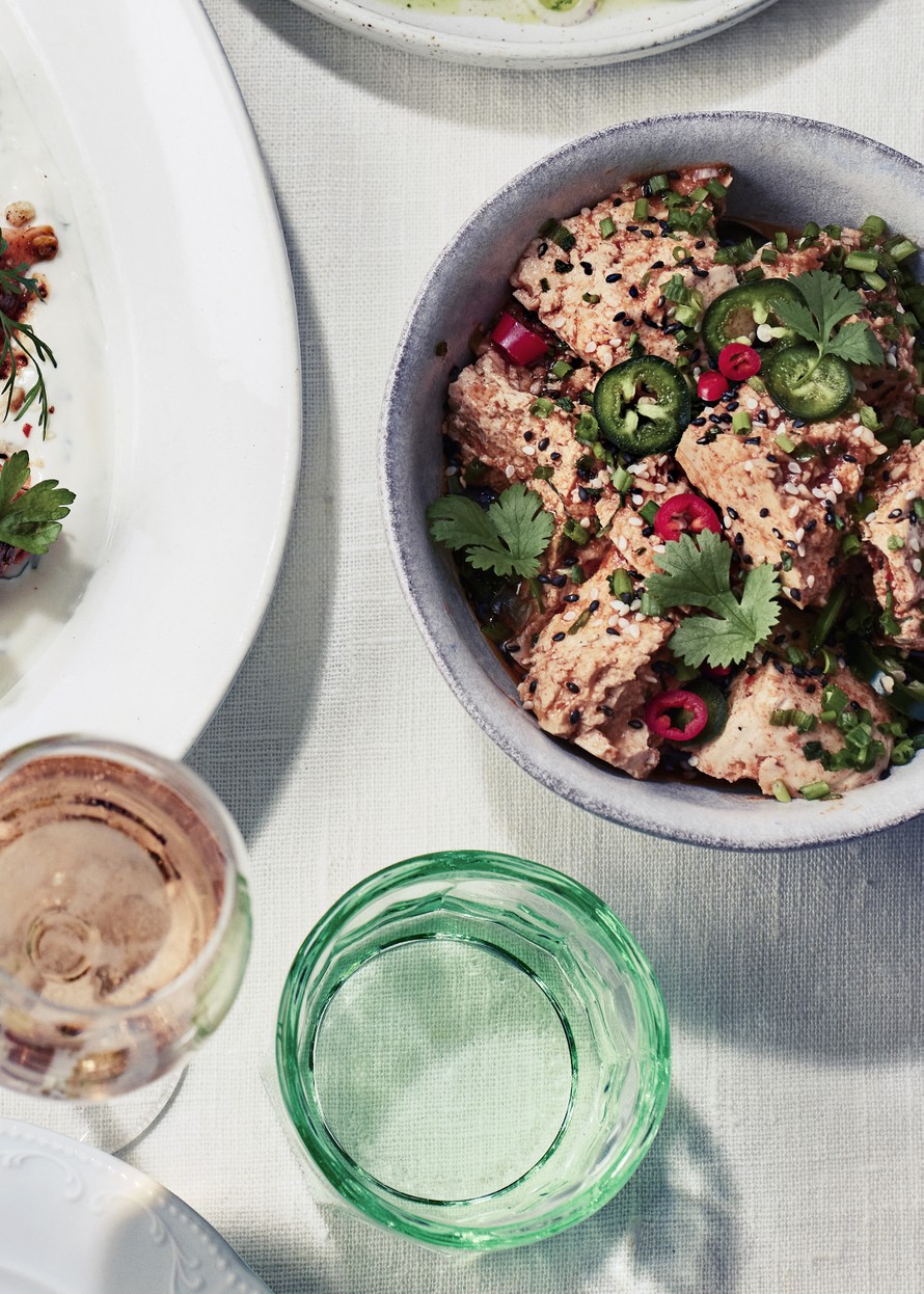 Mausteinen kylmämarinoitu tofu sopii sellaisenaan osaksi aasialaista illallista, joka koostetaan pienistä annoksista. Se sopii erinomaisesti myös riisin kanssa tarjottavaksi erilaisiin kulhoruokiin.