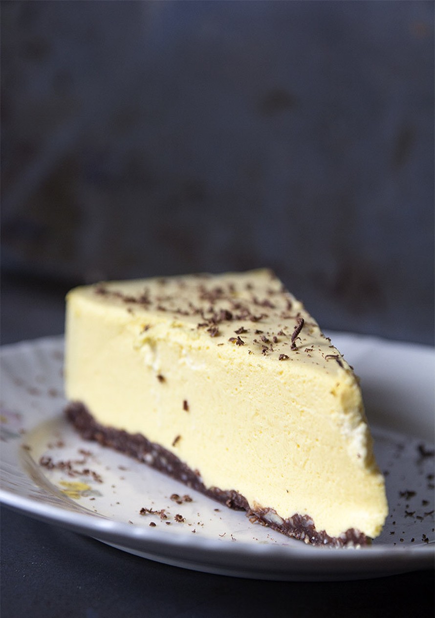 Aloita hienontamalla pähkinät blenderissä. Lisää joukkoon sulatettu voi ja muut aineet. Tarkista makeus. Levitä leivinpaperilla päälystettyyn irtopohjavuokaan tasaiseksi kerrokseksi ja laita jääkaappiin. Laita liivatelehdet likoamaan kylmää veteen. Vatkaa kerma löysähköksi vaahdoksi ja lisää joukkoon tuorejuusto. Sekoita tasaiseksi. Lisää joukkoon mangosose, sekoita tasaiseksi. Purista sitruunasta mehu ja kiehauta se kattilassa. Lisää hunaja. Ota kattila pois levyltä ja lisää joukkoon liivatelehdet. Sekoita kunnes seos on tasainen. Lisää hieman jäähtynyt liivate seos täytteeseen koko ajan rauhallisesti sekoittaen. Kaada massa pohjan päälle ja anna kakun tekeytyä ainakin neljä tuntia jääkaapissa. Koristele raastetulla tumallasuklaalla.
