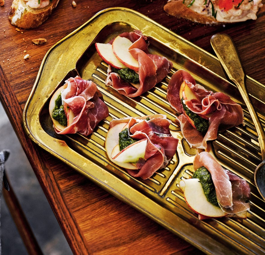 Hyvä ilmakuivattu kinkku ei kaipaa kuin palan kirpeää omenaa ja pestoa ja pintxo on valmis. Tee pesto basilikasta ja pistaaseista tai oikaise valmispestolla.