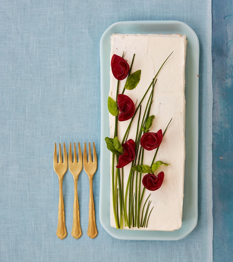 - Valmista kuorrute. Sekoita tuorejuusto ja ranskankerma sähkövatkaimella kuohkeaksi. Levitä kuorrute lastan avalla tasaiseksi kuorrutteeksi kakun reunoille ja päälle. Koristele kakku ruohosipulinvarsilla, kylmäsavuharkäviipaleilla ja muutamalla basilikanlehdellä.