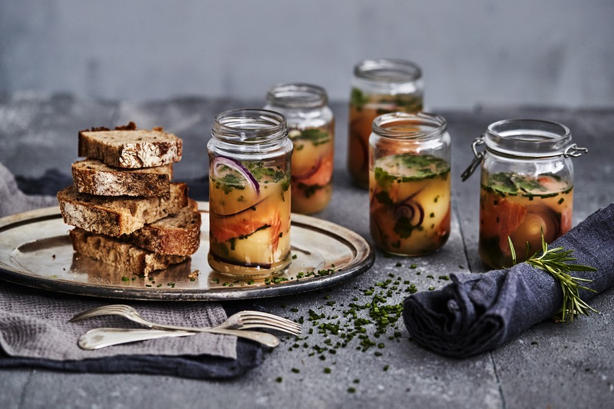 Kananmuna gelée on klassinen ranskalainen alkupala, jossa pehmeä kananmuna, kylmäsavulohi ja punasipuli saavat seurakseen herkullisen valkoviinillä maustetun kalaliemihyytelön. Annokset ovat näyttävä tarjottava seisovaan pöytään tai juhlaillalliselle.