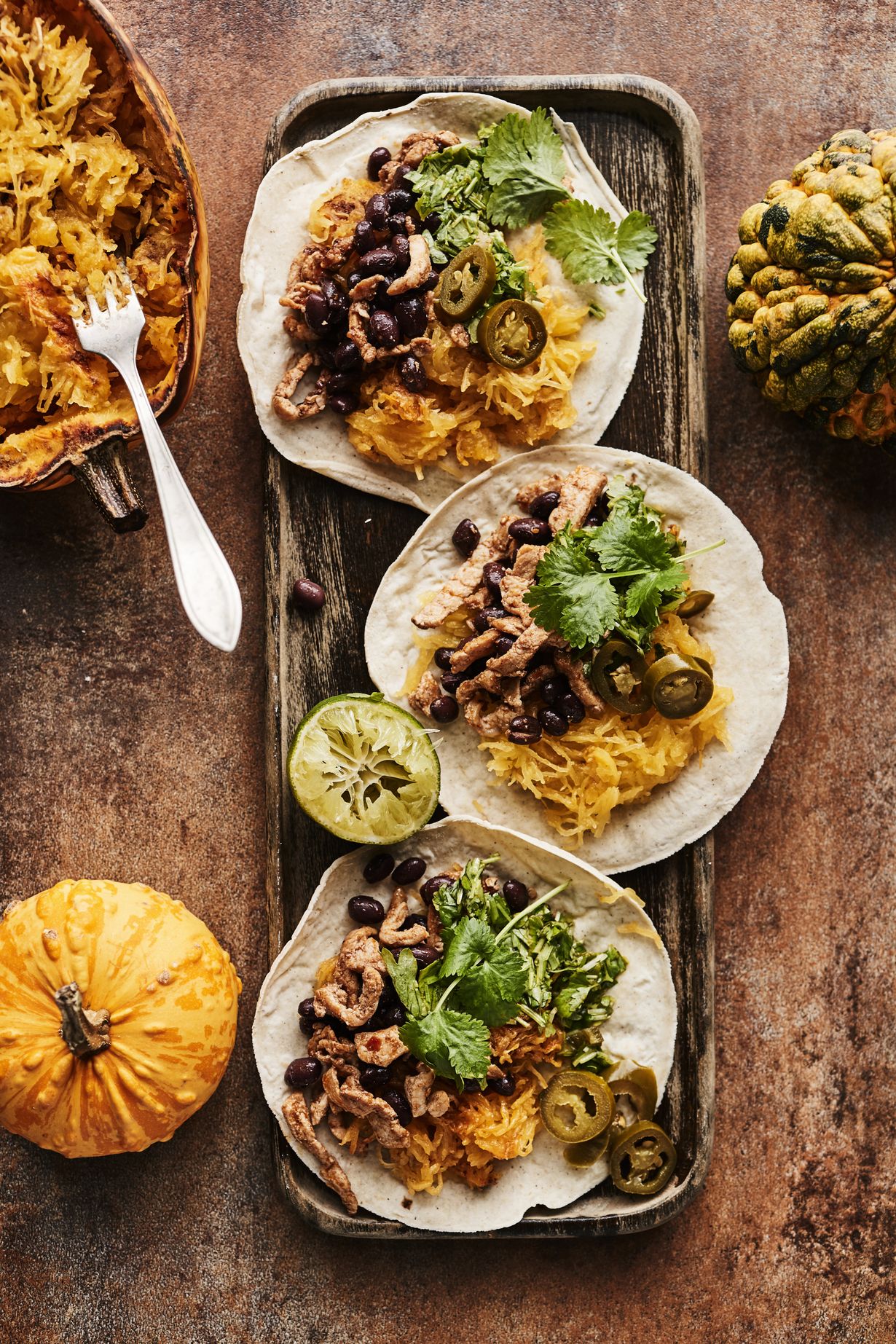 Mehevä tacontäyte nyhtökurpitsa valmistuu kypsäksi paahdetusta spagettikurpitsasta, joka riivitään kahdella haarukalla ennen tarjoilua. Paahda rinnalle mausteinen papu-possutäyte tai sen vegaaninen versio. Kasaa maissitortillan päälle, haukkaa ja nauti!
