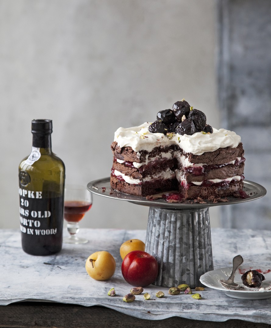 - Voitele leivinpaperi rypsiöljyllä. Keitä sokeri ja vesi kuultavaksi. Nosta luumut liotusliemestä; säästä liemi kakun kostukkeeksi. Upota liotetut luumut sokeriliemeen ja nosta valumaan leivinpaperille kahta lusikkaa apuna käyttäen. Luumuja ei keitetä, vaan ne vain käväisevät kattilassa saamassa kiiltoa pintaan. Anna luumujen kuivua toisistaan erillään vähintään 10 minuuttia ennen täyttämistä, kunnes pinta kestää koskettamisen.