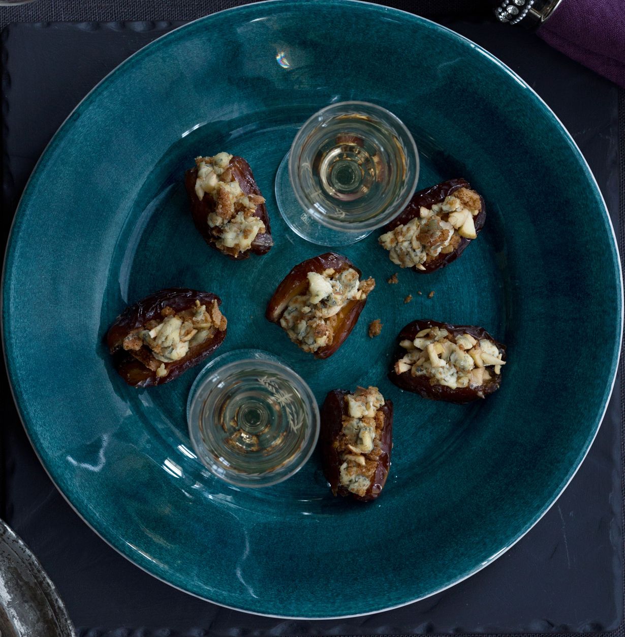 Sinihomejuustolla täytetyt taatelit ovat makoisaa sormisyötävää.