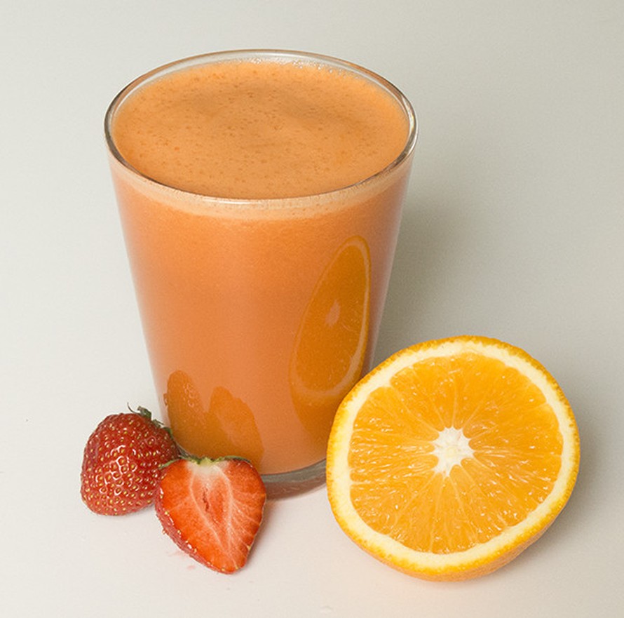 - Kuori appelsiini. Trimmaa porkkanasta päät ja kuori halutessasi. Voit jättää mansikkaan vihreät osat paikalleen.
