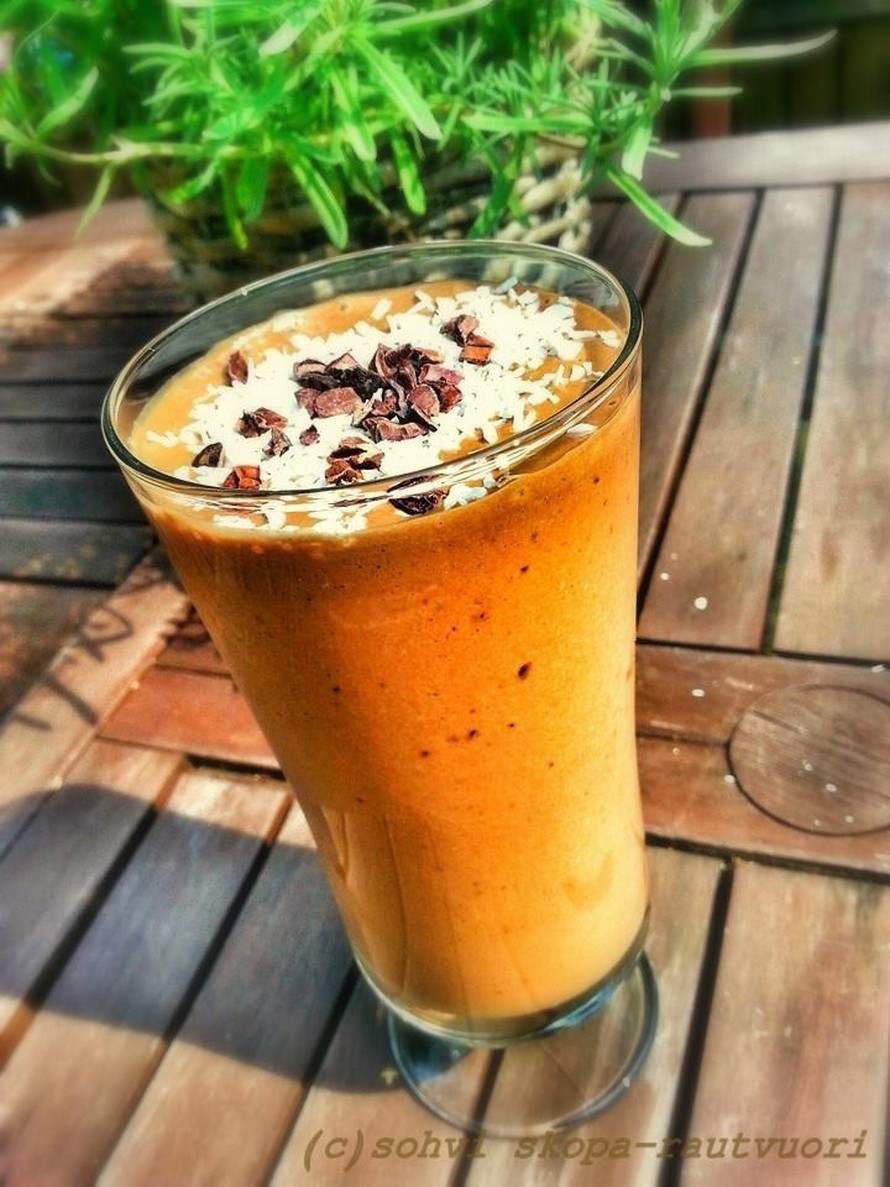Laita ainekset tehosekoittimeen ja pyöräytä tasaiseksi juomaksi. Koristele kookoshiutaleilla ja kaakaonibseillä.