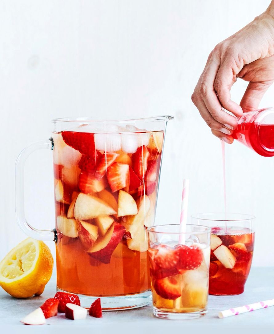 - Pilko mansikat ja nektariinit kannuun. Lisää kannuun kylmä tee ja runsaasti jääpaloja. Makeuta maun mukaan nektariinisiirapilla.