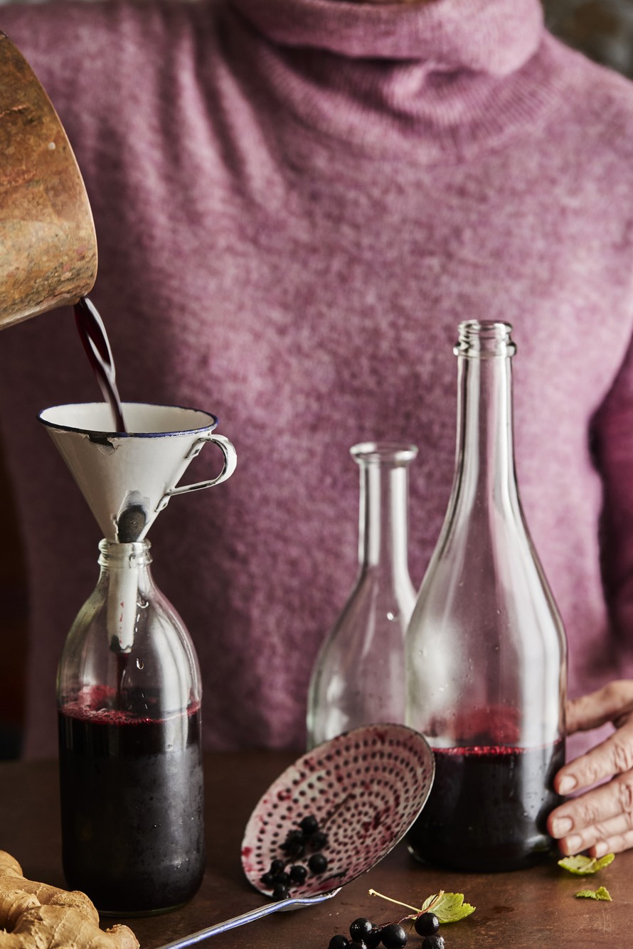 Inkiväärillä maustettu ja fariinisokerilla makeutettu mustaherukkamehu on harvinaisen herkullista. Flunssaista oloakin se helpottaa.
