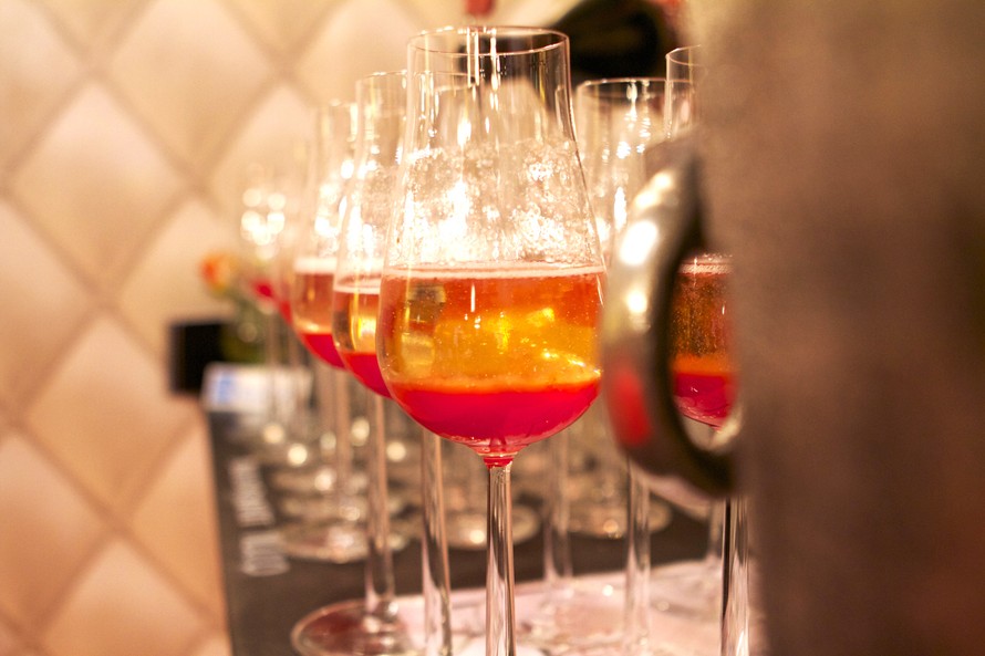 - Kerrosta päälle kuohuviini varovasti baarilusikalla. Koristele lakalla.