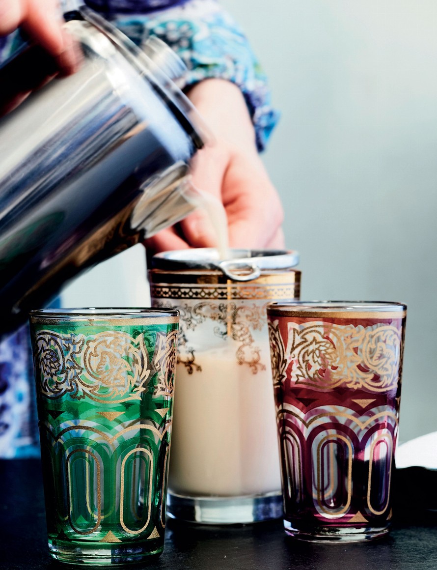 - Kuumenna kattilassa vesi, maito ja mausteet kiehuvaksi välillä sekoitellen. Kaada seos teepannuun ja lisää teelehdet. Anna hautua noin 5 min.