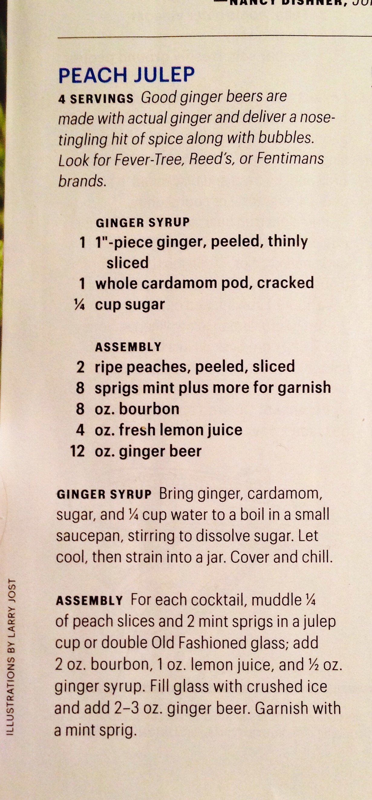 Amerikkalaisen bon appétit -lehden r.s.v.p-palstalla lukija halusi tietää memphisiläisen River Oaks -ravintolan Peach Julep -drinkin ohjeen, sillä "no cocktail is more refreshing than the ginger-spiked julep". Tässä se on - ja tekoon menee.