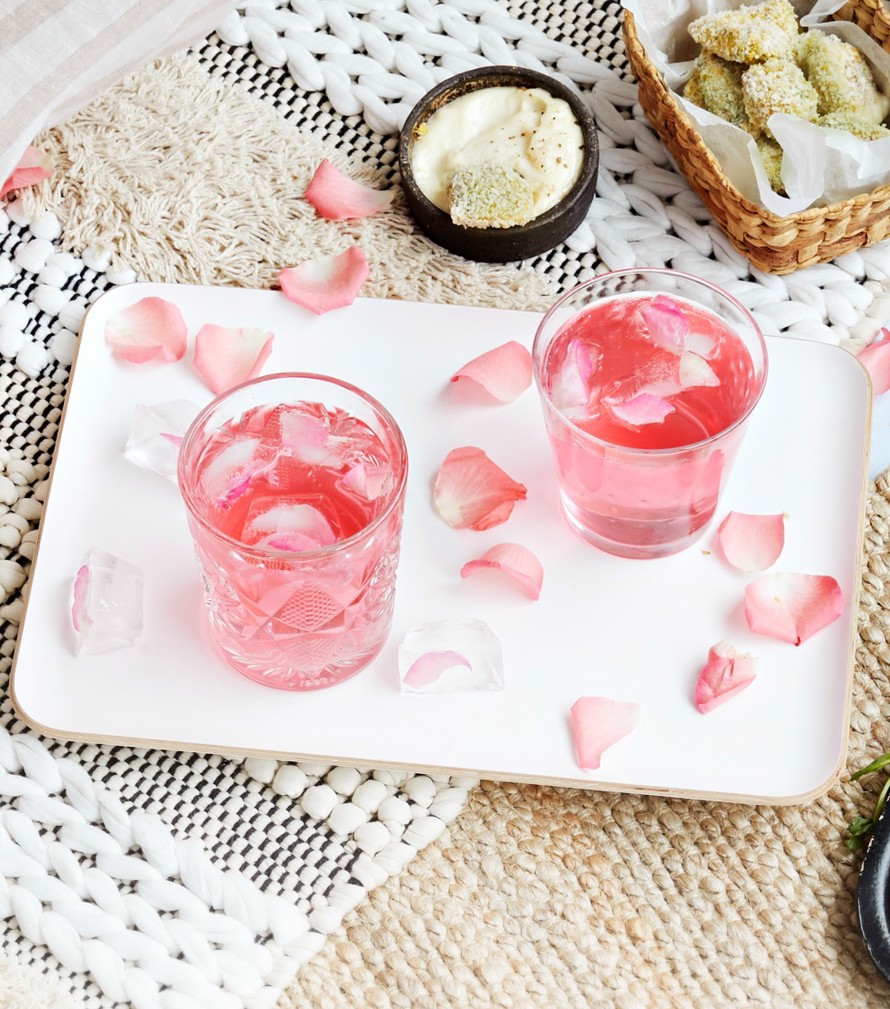 - Täytä lasit jäillä. Sekoita gini, ruusuvesi ja elintarvikeväri keskenään ja kaada laseihin. Kaada tonic päälle juuri ennen tarjoilua.