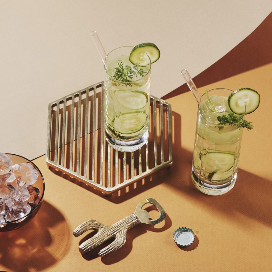 - Täytä lasit jääpaloilla. Siivilöi juoma laseihin. Koristele kurkkusiivuilla ja tillillä. Täytä lasit kivennäisvedellä.