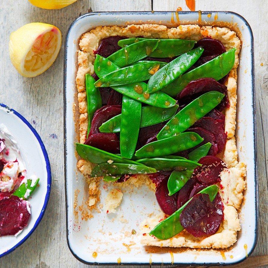 - Kokoa piirakka. Levitä puolet juustopilvestä jäähtyneen piirakan pohjalle. Valuta punajuuret siivilässä ja nostele kerrokseksi juustovaahdon päälle. Aseta sokeriherneet punajuurten lomaan. Tarjoa piirakka heti lopun juustopilven kanssa.