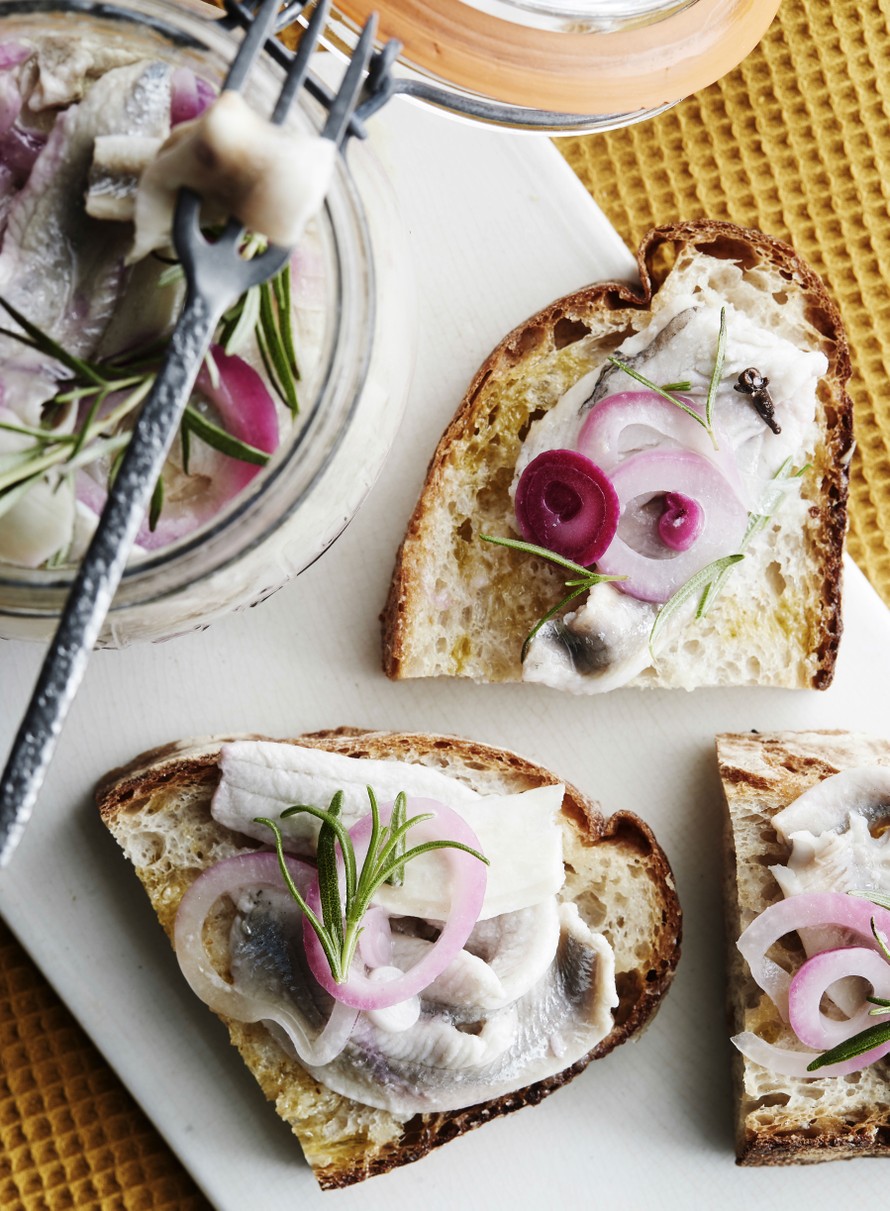 - Paahda maalaisleipäviipaleet. Hiero kunkin leivän pintaa valkosipulinkynnellä ja pirskota leiville oliiviöljyä. Lado silakkafileitä leipäviipaleille.