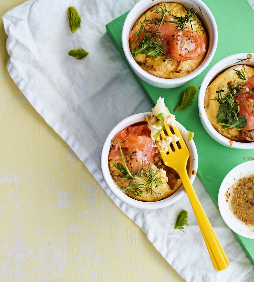 - Kiepauta munakaskuppien pinnalle lohisiivut. Koristele herneenversoilla ja lorauksella sinappikastiketta.