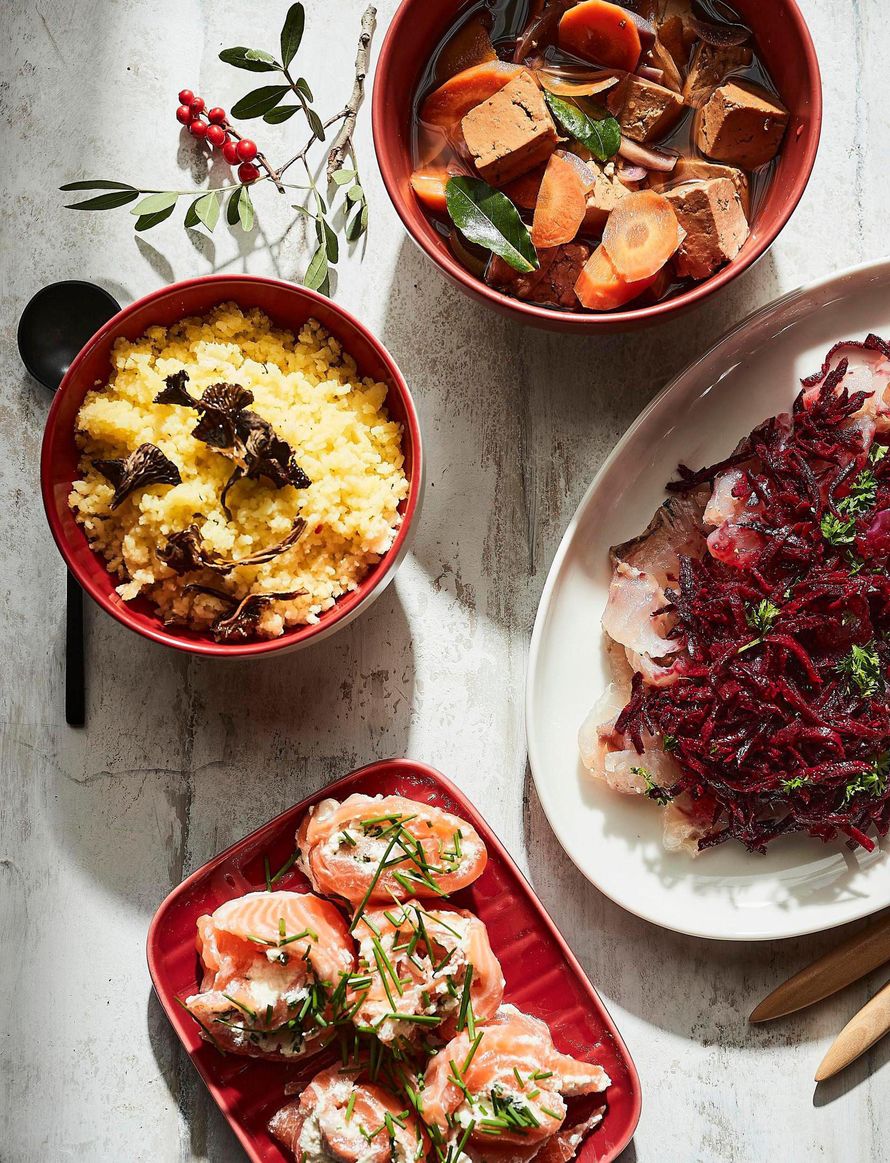 Alkupalapöytään on katettu lohirullia, punajuurisiikaa, marinoitua tofua ja helppotekoista perunalunta.