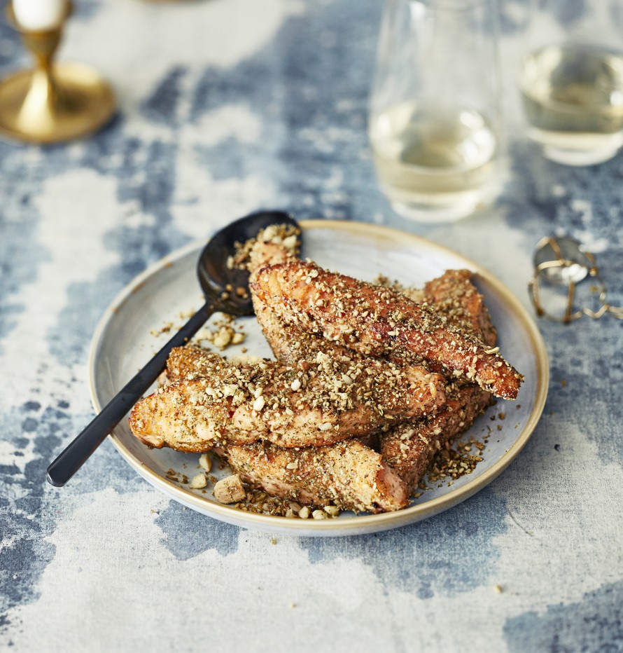 Juhlapöydän alkuruokalohi saa makunsa tillillä maustetusta, ihanan paahteisesta dukkahista. Kala paistetaan nopeasti pannulla, jolloin se jää sisältä roseeksi.