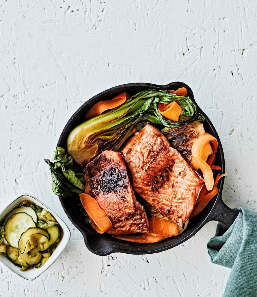 - Leikkaa paksoit puoliksi. Vedä porkkanasta ohuita lastuja juustohöylällä. Nosta lohipalat pois pannulta ja pidä lämpimiä folion alla. Pyyhkäise pannulta enimmät lohen rasvat pois ja pikapaista paksoita pannulla noin 2-3 minuutin ajan. Nostele lautasille paksoit, lohi ja porkkanalastuja. Lusikoi joukkoon loppu misomarinadi ja soijakurkkuja.