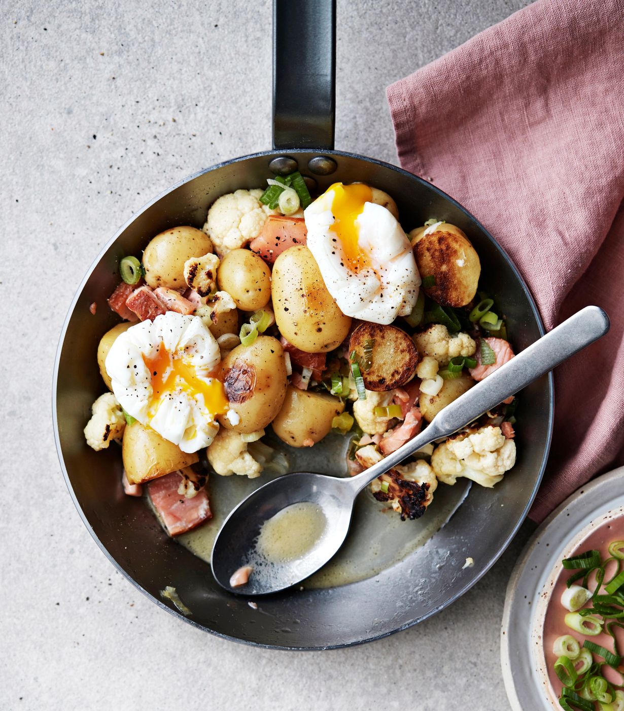 Valkoviini, voi ja perunan tärkkelys suurustuvat tässä pyttipannussa kuin itsekseen kastikkeeksi. Ja tuorekelmussa uppomunat onnistuvat aina!