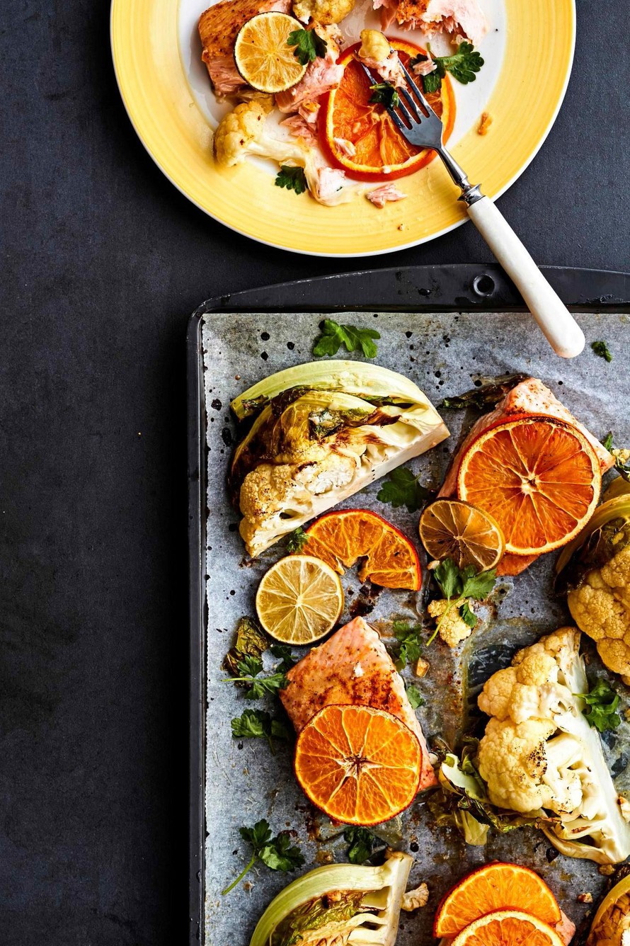 Ras el hanoutilla maustettu ja sitrusviipaleilla raikastettu limettilohi valmistuu näppärästi samalla pellillä kukkakaalilisukkeen kanssa. Mikä parasta: ruoka on valmista puolessa tunnissa.