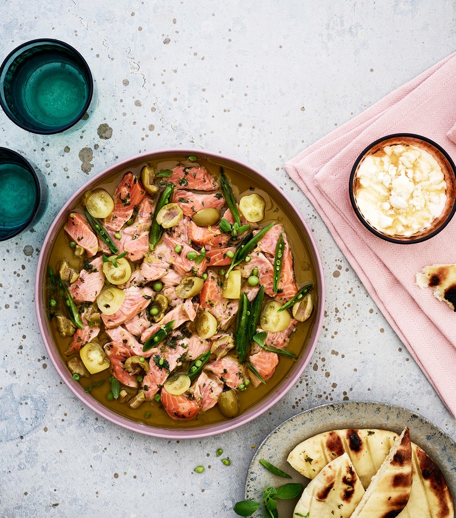 - Tarjoa kirjolohi pitaleipien ja fetadipin kanssa.