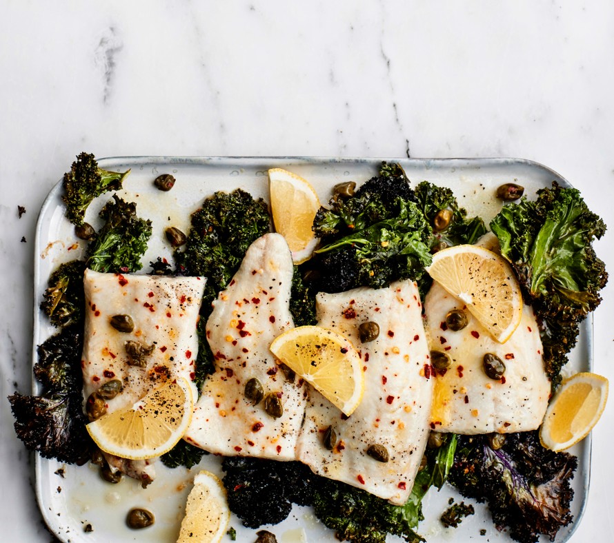 - Levitä lehtikaali uunipellille tai -vuokaan ja laita kalat kaalin päälle. Paista uunissa 15 minuuttia.
